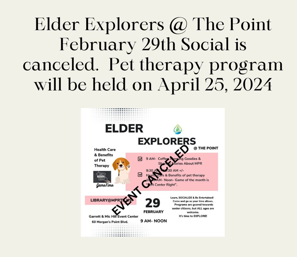 Elder Explorers @ The Point February 29th Social is cancelled. Pet Therapy program will be held on April 25, 2024