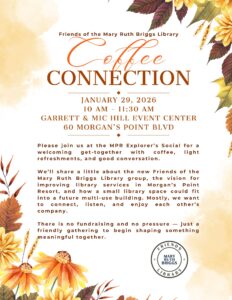 Join us at the MPR Explorer’s Social on January 29, 2026 at 10 AM, Garrett & Mic Event Center (60 Morgan’s Point Blvd) to visit with the Friends Directors and learn how you can help bring a stronger, more accessible library to life in Morgan’s Point Resort.